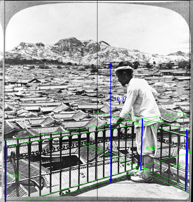 거리 비율로 보면 촬영 지점에서 모서리 부분의 난간까지의 거리를 1로 두면