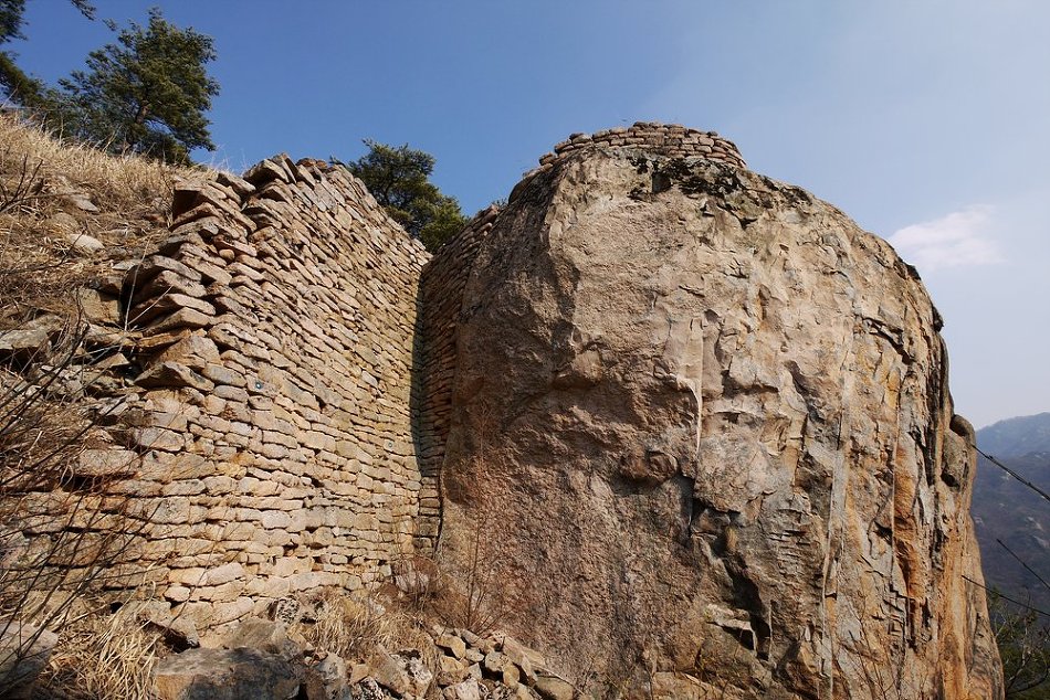 城壁は内外をハルソック(割石)で積んだネウェヒョブツック(内外夾築)で, 城壁まわりは 650m, 谷を成した所は
