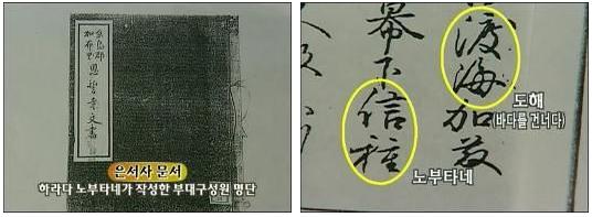 가토 기요마사 휘하의 여력부대 명단. 무사들의 이름 맨 위에, 하라다 노부타네라는 이름이 적혀 있다. 하라다 가문의 족보에도, 하라다 노부타네가 조선에 출병한 기록이 나와있는데, 출병 후 그가 사라졌다는 기록을 발견할 수 있다. 조선에서 죽었거나, 혹은 투항했을 가능성을 말해준다.