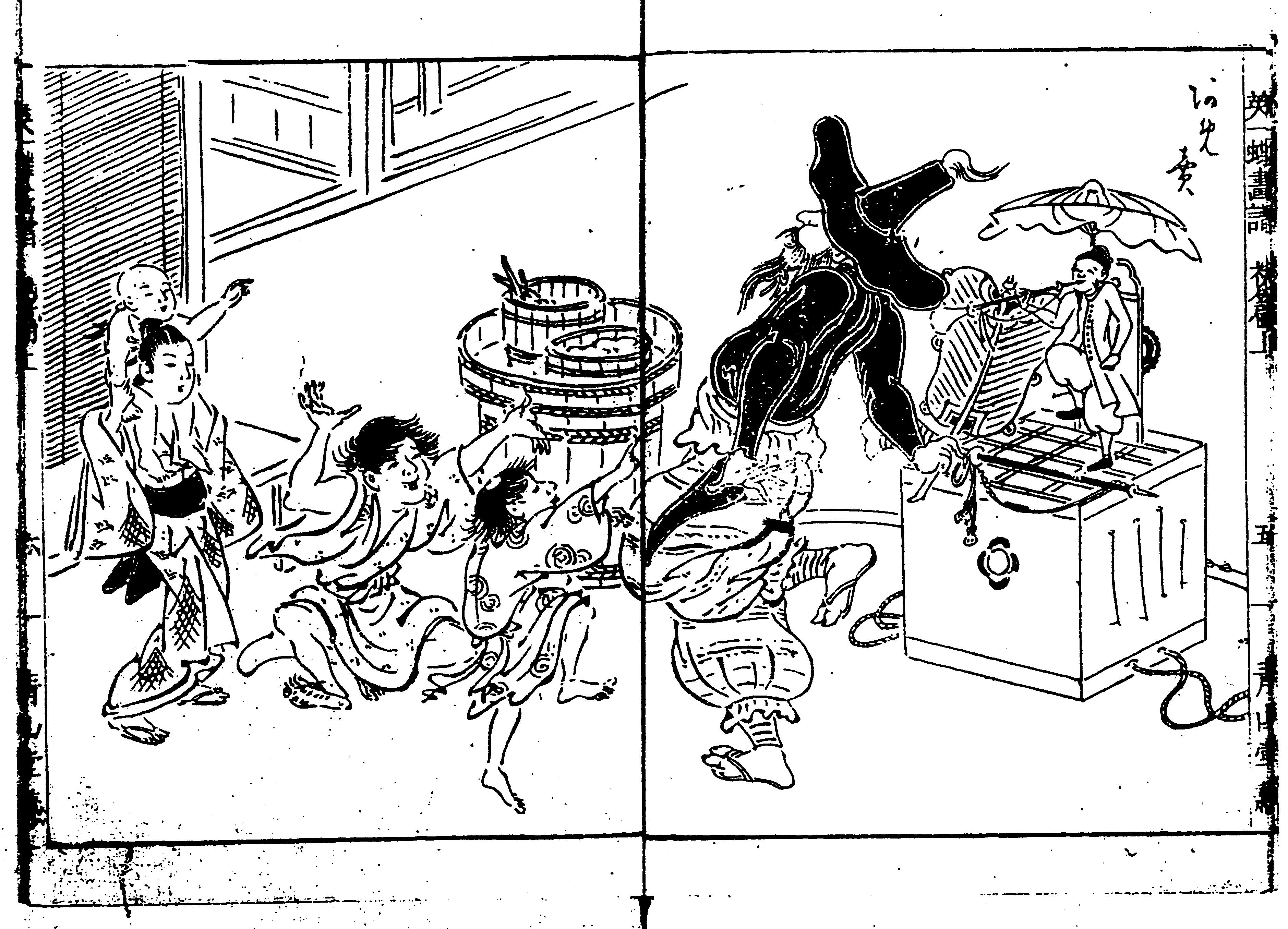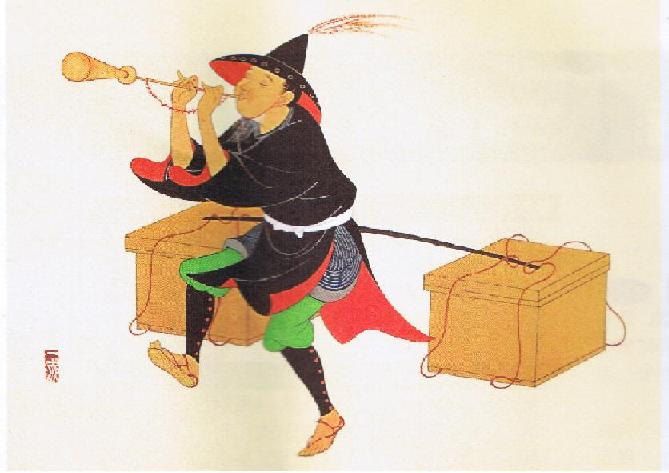 중국인 엿장사의 모습을 잘 보면, 그 많게는 중국인풍은 아니다.새의 새의 깃과 꽁지의 모자나 의상의 특징은, 오히려 조선 통신사의 그래서 있다.에도기를 통해서 일이회에 미치는 통신사의 일본 방문은, 쇄국하의 일본에 큰 문화적 영향을 내렸던 것이 알려져 있어 통신사의 의복을 본뜬 행사나 물건들은, 그 통과지에 머무르지 않고, 넓게 각지에 남는다.