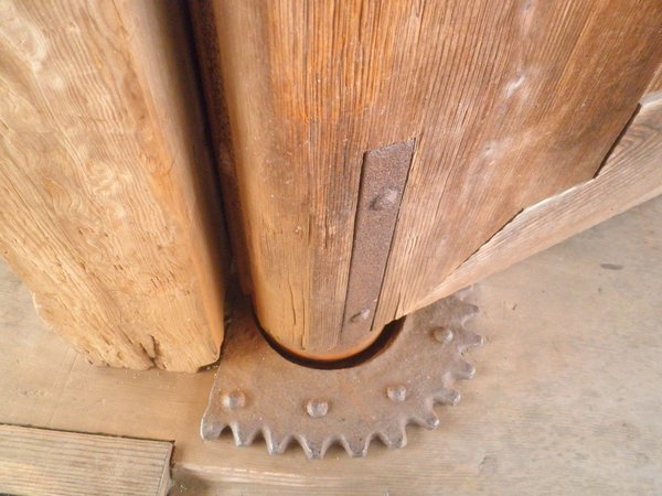 横に通した木材に穴を開け、そこに扉に取り付けた突起をはめ込んで扉を回転させる。