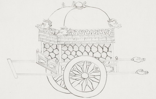 먼 저 지붕 모양을 만들고, 처마는 운두(雲頭)를 만들어 아청색(鵝靑色)의 저사(紵絲)로써 덮어씌워서, 이에 수레 위에 둔다. 홍색·녹색·흑색의 저사(紵絲)를 사용하여 염의(簾衣)와 낙영(落纓)을 만들어 사방의 처마에 드리운다. 사면(四面)에 장자(障子)를 설치하고【전면(前面)에 분합(分闔)을 설치한다. 】모란(牧丹)을 그려서 주렴(朱簾)을 밖에 드리우고 또 난간(闌干)을 설치한다.