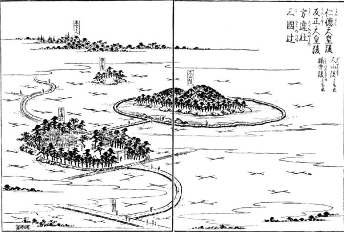 그 림에서는 그 오른쪽으로 늘어서 있는 것이 伝仁徳陵(「大山陵」이라고 설명되고 있다)으로, 그 좌상에 아득히 먼 느낌의 원근법으로 그려져 있는 것이 伝反正陵(「楯井陵」이라고 설명되고 있다), 그 더욱 저 편으로「王子ヶ飢」(당시의 묘소)가 있다.