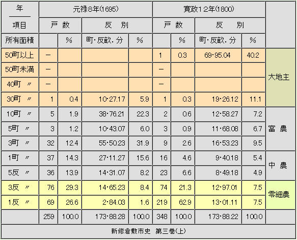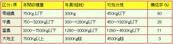 부 농, 중농이 분해해 영세농에게 전락한 것을 알 수 있다.寛政12년(1800)에는 호수의 84. 2%가 3反(300평) 미만이다.그 소지하는 면적은 15%로, 한편 대지주는 2채에서 경작 면적의 51. 3%를 점유 했다.3反으로의 수확량은 많이 추측해도 600 Kg이다.50%이상 공납 당했기 때문에 실수입은 300 Kg로 1년간 생활해야 한다.의식주, 비료・농기구대도 포함한 것이다.