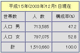 平成15年(2003年)の山口県の人口である。男性に比し女性は1割強多い。