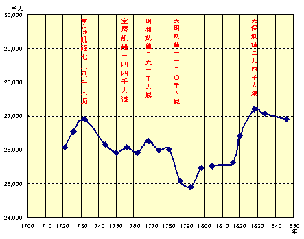 江戸時代の人口調査から求められたグラフを見れば天明の飢饉で 1,120,000人の人口減少が現われるある.