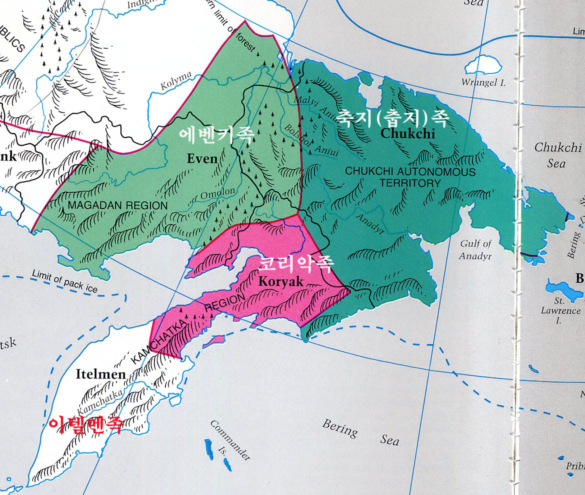 旧ソ連スターリン時代(1930‾40年) コリャック族は自治区(州より一段階の下組職である 郡に該当)で承認受けたし, 当時自治区私の人口は狩人であるロシア人たちを含んで約58,000人余りだったし, 腕だか行政都市には 15,000人余りが住んでいた.