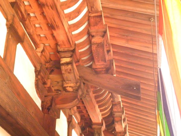 長弓寺のGejinは3間大虹梁が2本架けられているのだ。一面に天井を貼って梁を隠すのではなく、「どうだ、この梁を見てくれ」と言わんばかりである。ただ、写真の通り、さすがに3間は無理があったらしく、後で入側筋に柱を追加しているが。