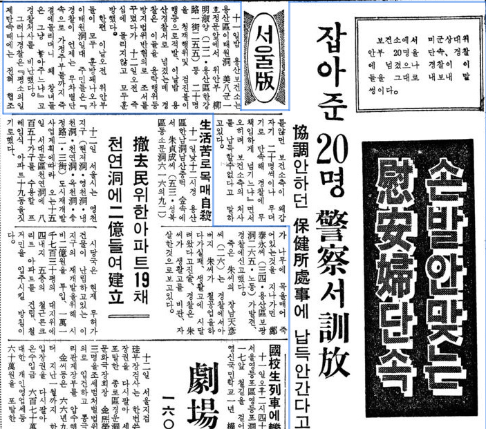 一方この日午前慰安婦たちが皆訓戒されて出ると梨泰院洞一帯住民たちは警察がいつは無差別取り締まりで家庭主婦たちまで即決に回したらどうして娼婦たちはそのまま放してやると警察仕打ちを責めた.