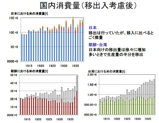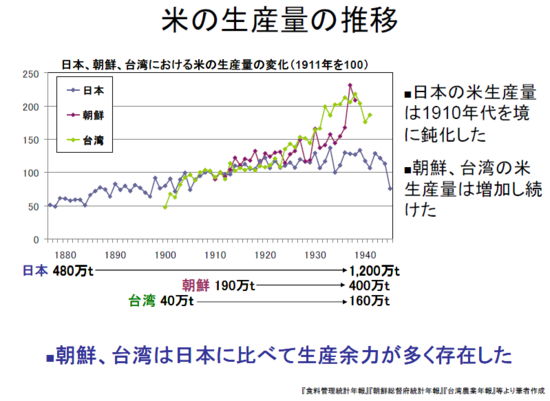 次に、日本史上たしかに、米の生産量と人口がほぼ一致している時期があり、それは19世紀末から20世紀初頭にかけてのことだったのだが、このような時期はむしろ例外的というべきで、1870年代には、米の生産量が2500万石程度だったのに対して、人口は3300~3400万人だった。また、19世紀末以降には米の輸入もあって、国内の米生産量を総消費量が上回っていることも、人口と米生産量の関係を推測するさいには考慮に入れなければならないだろう。