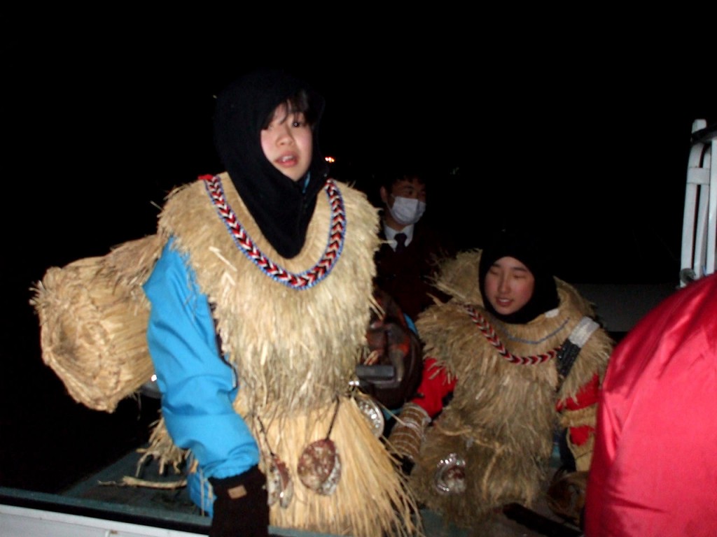 岩手県大船渡市三陸町吉浜で15日、小正月の伝統行事「吉浜のスネカ」が行われ、恐ろしい面をつけたスネカが民家を訪ね、子供たちを脅かしながら歩いた。