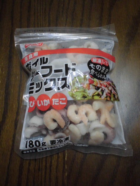 이 날의 저녁 식사의, 오코노미야키(okonomiyaki)의, 씨푸드(seafood)의 도구.냉동의 씨푸드 믹스(새우·오징어(오징어)·낙지).생 식용의 물건으로, 해동하고, 사라다(salad)의, 토핑(topping) 등으로서 그대로 먹을 수 있는 것입니다.