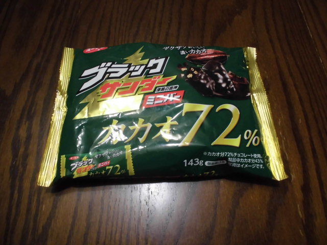 有楽(yuraku)製菓(日本の、1955年創業の、菓子会社)の、ブラックサンダー(black thunder)と言う、チョコレート(chocolate)菓子の、カカオ(cacao)分が多い物。