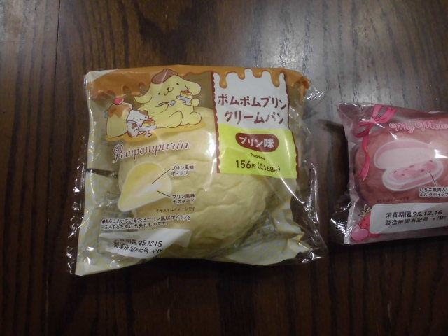 左、ポムポムプリン(Pom Pom Purin)、クリーム(cream)パン(プリン(crème caramel)味)。右、マイメロディ(My Melody)、コッペ(koppe)パン(苺(strawberry)ミルク(milk)味)。