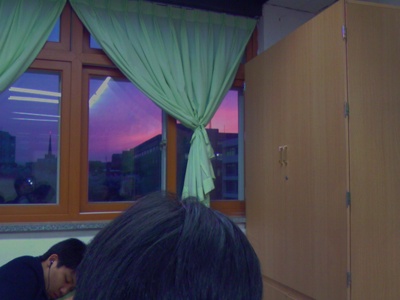 窓の外で夕陽? いや本当に不思議な光景が見えます.