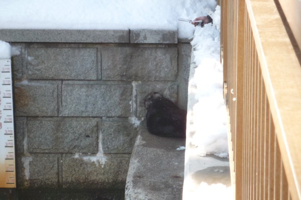 橋のたもとの岸壁で、ラッコがくつろいでいました。