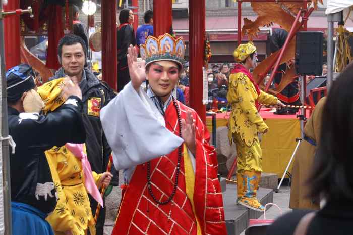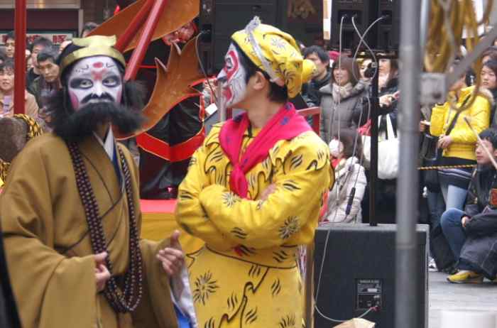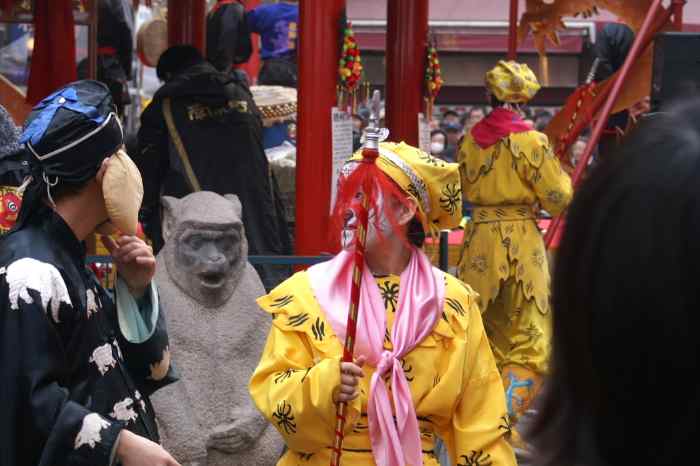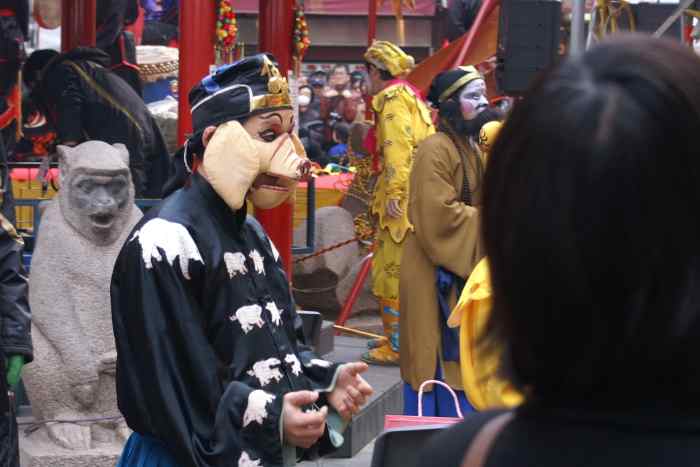 お堂の下で何かに扮装をした人です 中国の京劇の扮装なので、何の役の・扮装かはよく分かりません・