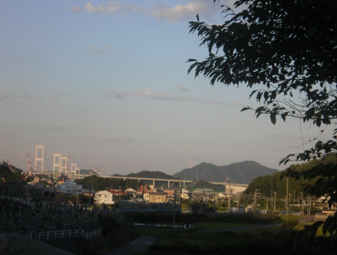 池に通じる道からは、今治市の来島海峡大橋や造船所のクレーン、予讃線波方駅などを眺めることができます。