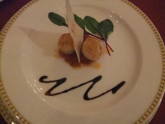 私が食べた前菜。帆立のポワレ(poele)、バルサミコソース(balsamic sauce)。