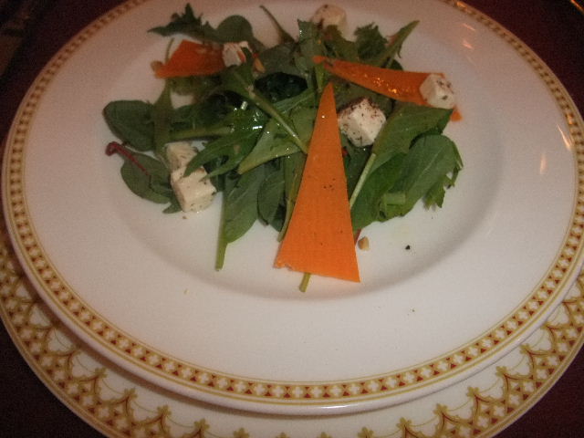 こちらは、チーズ(cheese)と胡桃とベビーリーフ(mesclun)のサラダ(salad)。黄色く見えるのは、人参ではなくて、チーズ(cheese)。