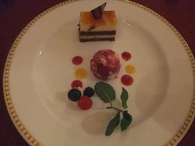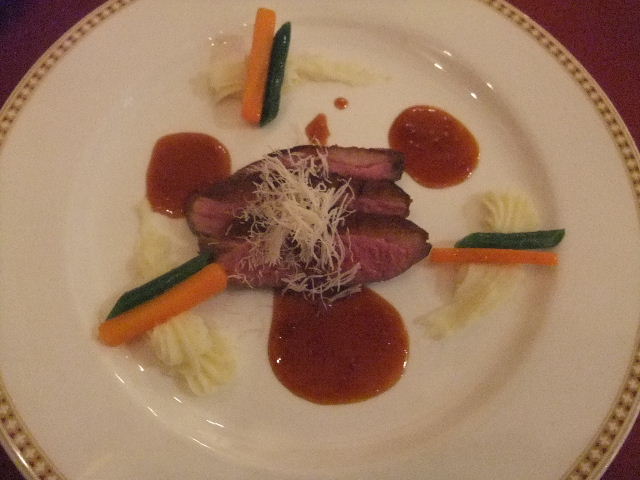 メイン(main)料理。鴨肉(鴨の胸肉)のロースト(焼き物)、オレンジソース(orange sauce)。一人一皿ずつ。二人共、同じ物を食べました(写真は、一人分)。