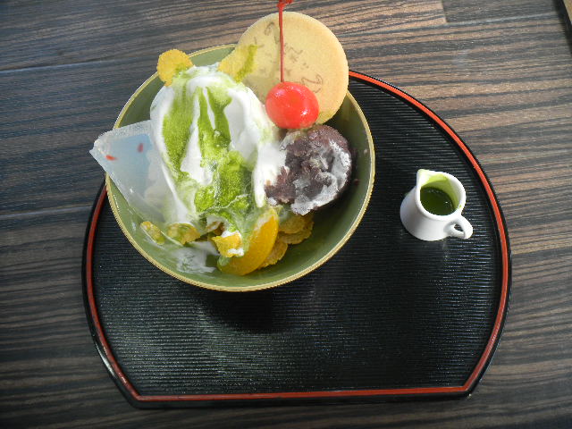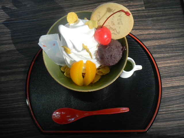 写真以下3枚。この時、鬼太郎(kitaro)茶屋で食べた、おやつ。一反木綿(ittan-momen)サンデー(sundae)。甘い餡子が載せられる等、日本風に仕立てられたサンデー(sundae)です。左側に、一反木綿(ittan-momen)の形をした、寒天(kanten。日本の伝統的な、ゼリー(jelly)状の、食品・おやつ・デザート)が載っています。