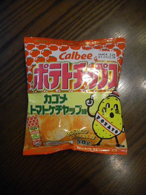 カゴメ(kagome)(1899年創業。名古屋都市圏発祥の会社。東京と名古屋に拠点を置く。日本を代表する、ケチャップ(ketchup)の会社であると共に、日本最大のケチャップ(ketchup)の会社でもある)のケチャップ(ketchup)味の、Calbee の、ポテトチップ(potato chips)。