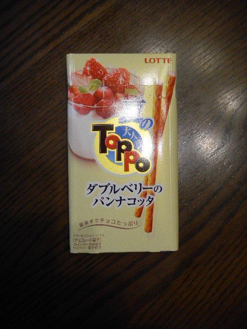 Toppo。ロッテ(lotte。日本の大規模菓子会社の一つ。韓国の方は、ご存知の通り、韓国のロッテ(lotte)財閥と関係が深い会社。1948年創業)の製品。Glico(日本の大規模菓子会社の一つ。1921年創業)のPocky(1966年発売開始)に似た感じの、棒状の菓子ですが、中にチョコレートが詰まっている所が、特徴となっています。これは、2種類のベリー(berry)の、パンナコッタ(panna cotta)味のToppoです。