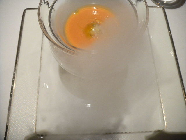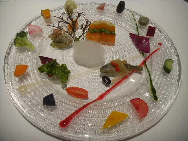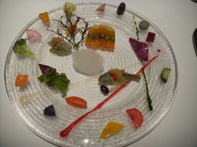 사진 이하 2매.2접시 눈앞나물.카이 아카네준(kai akane masu.야마나시(yamanashi) 현산의, 고품질인 준(trout))이나 여자등산가(yamame.민물 고기의 하나), 순의(계절의), 현지산 야채를, 충분하게 사용한, 사라다(salad) 완성의 전채.중앙의 거품은, 조개의 추출물로 만든 거품입니다(당연, 먹을 수 있습니다).