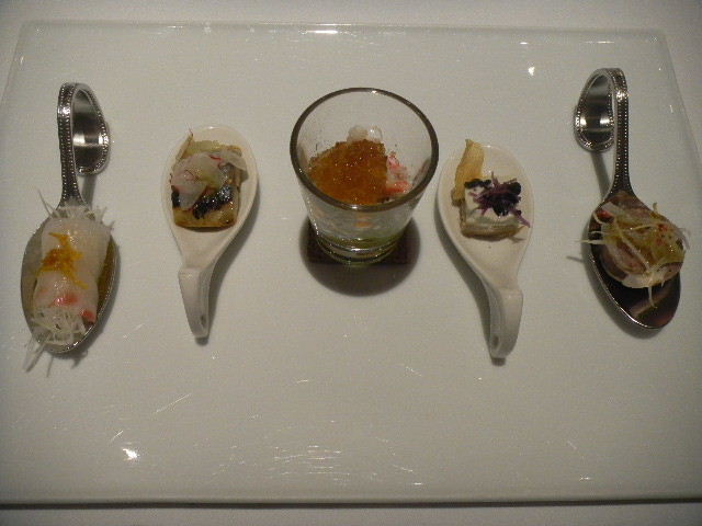 一皿目の前菜。色々な、地元産の食材を使った、一口前菜盛り合わせ。一番右端は、鹿肉を使った物。