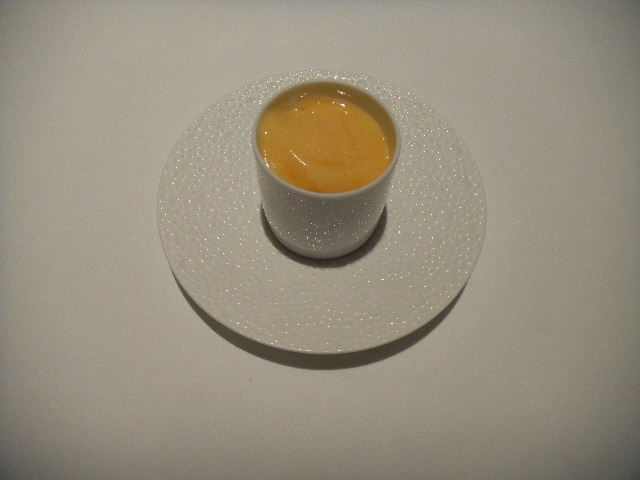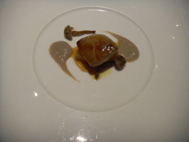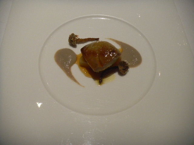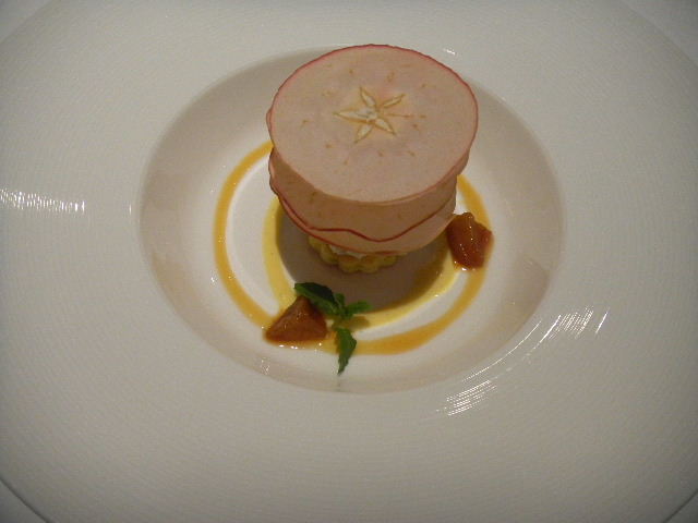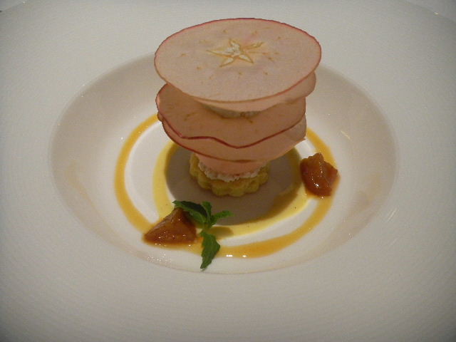 写真以下2枚。三皿目の前菜。フォアグラ(foie gras)のソテー(焼き物)、地元産の茸の、ムース(mousse)と、明野(akeno)(北杜(hokuto)area(山梨(yamanashi)県の北西部地域)の一地域。旧、明野(akeno)村)で採れた浅尾大根(明野(akeno)産の、高品質な大根)の、コンポート(compote)添え。