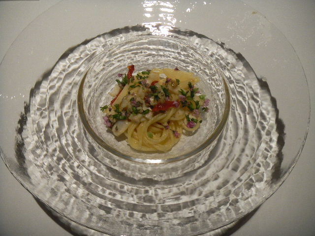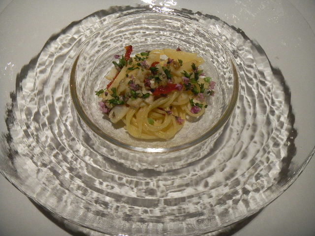 写真以下2枚。一皿目のパスタ(pasta)。カマス(魚)と、地元産の野菜が入ったパスタ(pasta)。