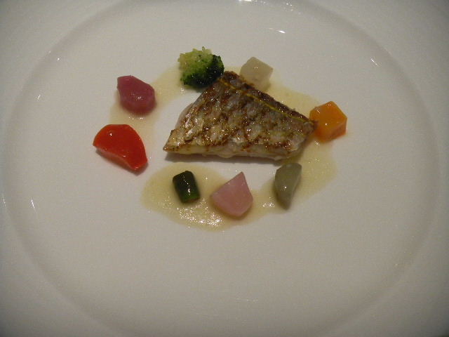 물고기의 메인(main) 요리, 이트요리도미의 석쇠 구이, 다양한 현지산의 야채를 사용한 소스(sauce).