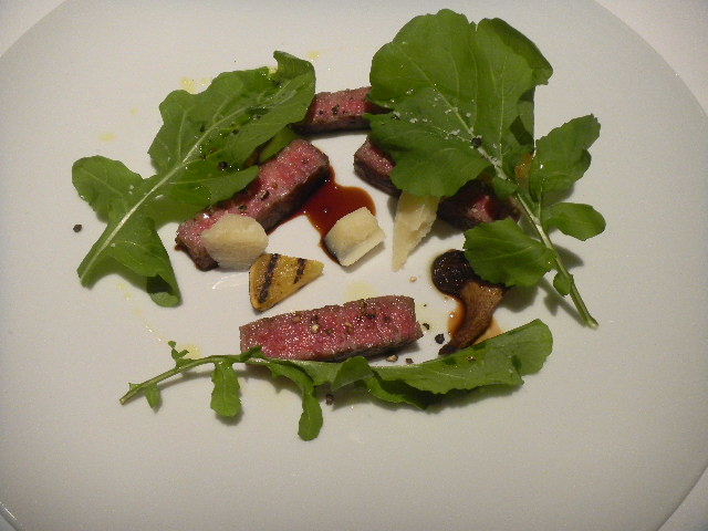 사진 이하 2매.고기의 메인(main) 요리.사과로 자란(사과를 사용한 사료로 자란) 소의, 신슈(shinsyu) 우(나가노(nagano) 현산의, 고급 쇠고기)의 로스트(구이), 야마나시(yamanashi) 현산의 바르사미코(balsamic vinegar)를 사용한, 바르사미코소스(balsamic sauce)와 함께...덧붙여서, 나가노(nagano) 현은, 사과의 주요한 산지, 야마나시(yamanashi) 현은, 포도와 와인(wine)의 주요한 산지가 되고 있습니다.