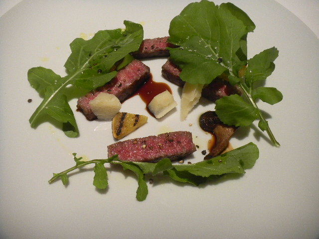 写真以下2枚。肉のメイン(main)料理。林檎で育った(林檎を使った飼料で育った)牛の、信州(shinsyu)牛(長野(nagano)県産の、高級牛肉)のロースト(焼き物)、山梨(yamanashi)県産のバルサミコ(balsamic vinegar)を使った、バルサミコソース(balsamic sauce)と共に。。。ちなみに、長野(nagano)県は、林檎の主要な産地、山梨(yamanashi)県は、葡萄とワイン(wine)の主要な産地となっています。