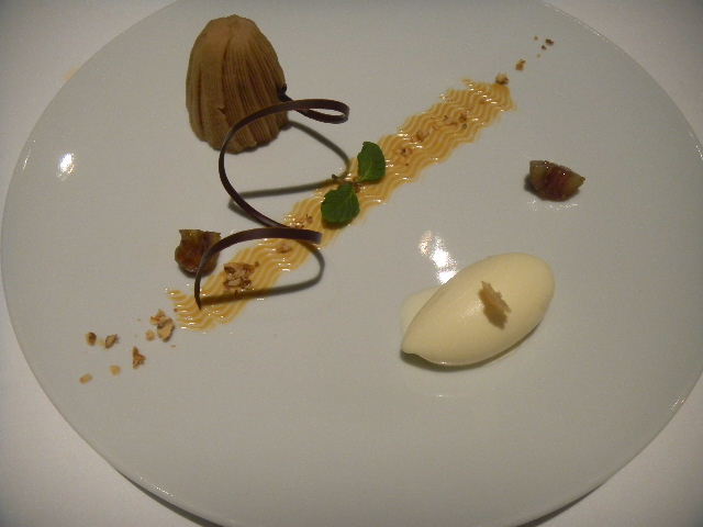 彼女が食べた、デザート(dessert)。モンブラン(Mont Blanc)(栗を使ったデザート(dessert))、地元産のジャージー牛(Jersey cattle)の牛乳の、ジェラート(gelato)と共に。。。