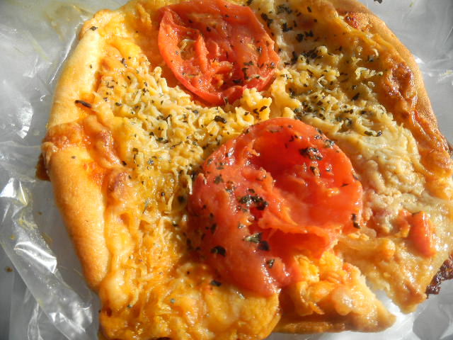 持ち運んでいる途中に、トマト(tomato)から、水が出てしまいましたが(見掛けは、悪くなりましたが、トマト(tomato)の水が出て、少し、水っぽくなっても、味は、美味しかったです)、シラス(鰯の子供)とトマト(tomato)のピザ(pizza)。