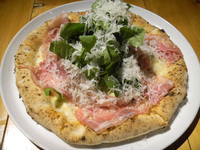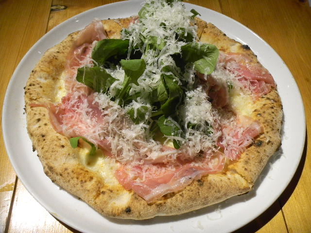 写真以下2枚。モッツァレラチーズ(mozzarella)、生ハム(ham)、ルッコラ(rucola)、パルミジャーノ(Parmigiano-Reggiano)の、ピザ(pizza)。