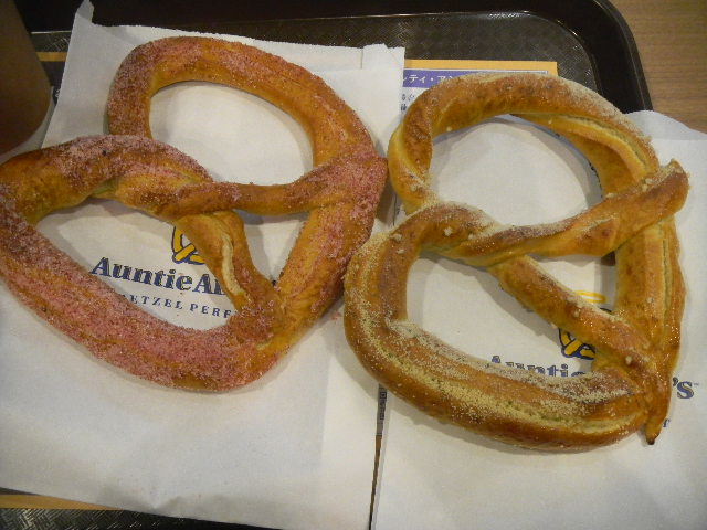 昨日、昼食後、吉祥寺(kichijyoji)の取引先の一つを訪れた後、移動の合間に、Auntie Anne’sの、電車(韓国式に言えば地下鉄)の、吉祥寺(kichijyoji)駅の店舗で、一休み(ちょっと休憩)して、食べた、おやつ。苺ミルク(苺milk)の、プレッツェル(pretze)(左)、サワークリーム&オニオン(sour cream&onion)の、プレッツェル(pretzel)(右)。