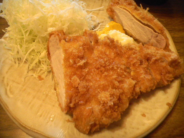 汚くて、申し訳ありませんが、食べている途中の様子。。。この様に、完全に横にした方が、肉の厚さが分かるかな。。。この店の、豚カツ(tonkatsu)は、厚い方です。肉の脂身も、衣と合って、美味しいです。