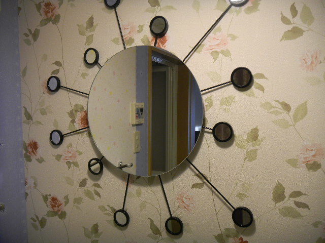 写真以下2枚。洗面所の鏡。鏡に写っているのは、bathroom(浴室。風呂場)の扉。