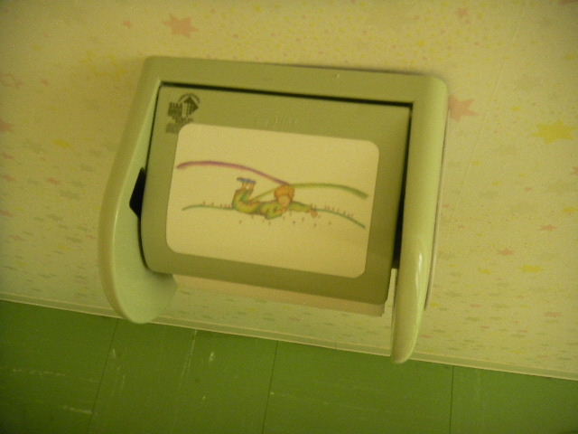 トイレ(トイレの部屋)と、洗面所の、壁紙(wallpaper)の、星の模様は、暗くすると、光るようになっています。夜、電気を消して、便器に座ると、宇宙空間の中で、便器に座っている様な、気分になりますw  大衆的な、宿泊施設なので、さすがに、bathroom(浴室。風呂場)までは、星の王子様(The Little Prince・Le Petit Prince)を、テーマとした物にはなっていないのですが、大衆的な、宿泊施設の割に、よく、細部まで、頑張っているな(細部まで、凝っているな)と言う感じです。
