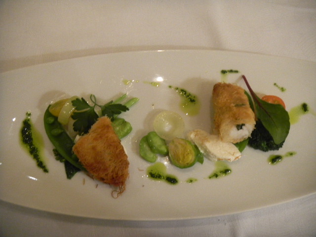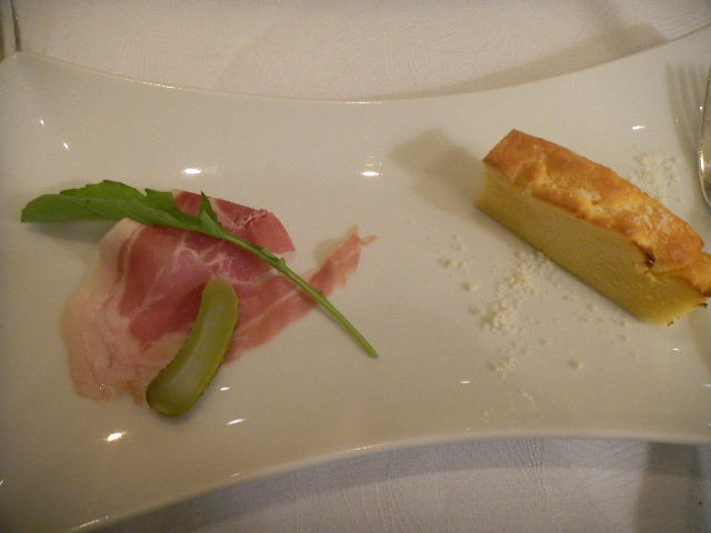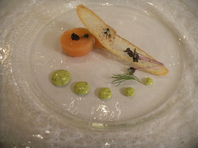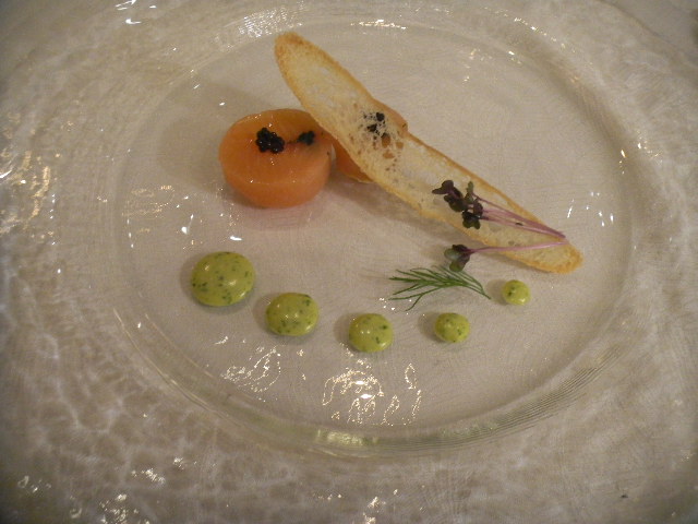 写真以下2枚。前菜。マス(trout)と、キャビア(caviar)。