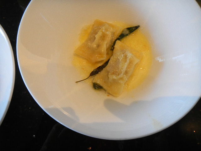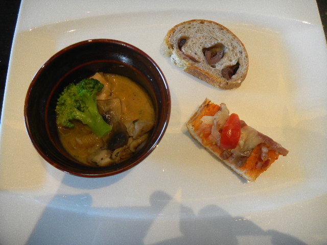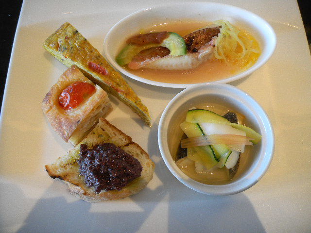 写真左下、他の食べ物に、ちょっと埋もれてしまっていますが、ロブスター(lobster)と、蟹(ズワイ蟹)の、テリーヌ(terrine)。
