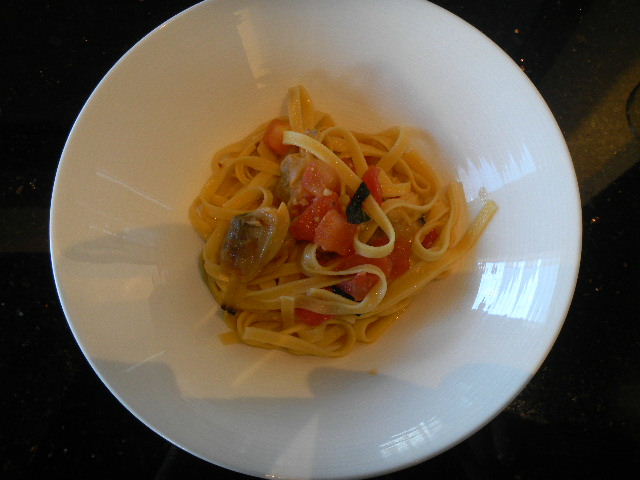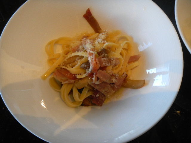 写真以下3枚。パスタ(pasta)。パスタ(pasta)は、実演方式(バイキング(buffet)において、あらかじめ作った物を置いておくのではなく、コック(cook)が、その場で、料理を作る形式)。