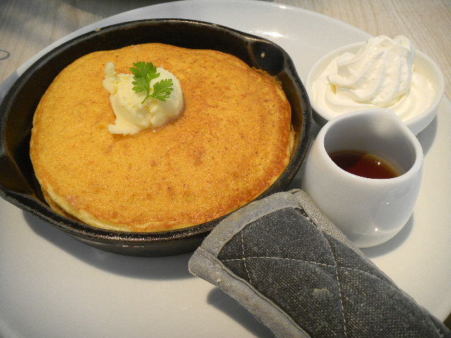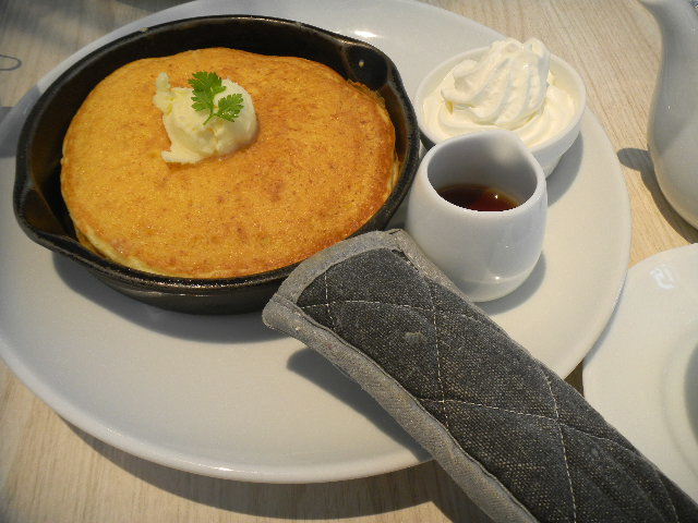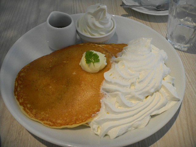 写真以下4枚。この時、このカフェ(cafe)で食べた、パンケーキ(pancake)。この時、飲み物は、私は、バニラ(vanilla)クリーム(cream)teaを、彼女は、チェリー(cherry)ベリー(berry)ティー(tea)を、飲みました。