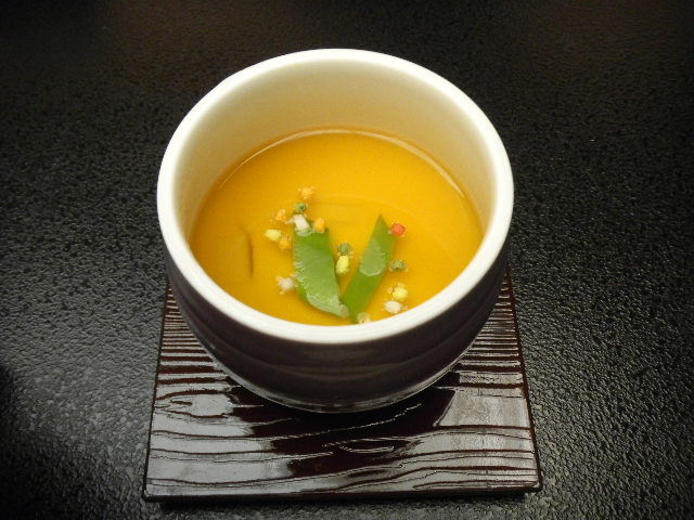 좌상의 접시, 범립(scallop) 사라다(salad), 서몬트라우트(salmon trout) 유자나무암 구워, 하코네(hakone) 스시.사진하, 참깨두부.사진 우상, 생선회(다랑어, 도미, 칸파치(잿방어·kanpachi)).
