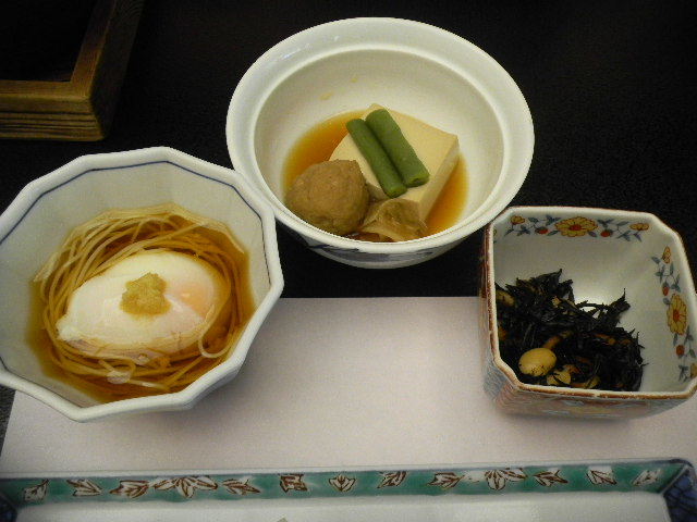 左上の皿、帆立(scallop)サラダ(salad)、サーモントラウト(salmon trout)柚子庵焼き、箱根(hakone)寿司。写真下、胡麻豆腐。写真右上、刺身(鮪、鯛、カンパチ(間八・kanpachi))。