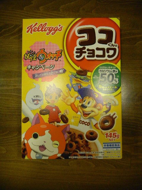 別荘滞在中の、朝食(遅い朝食兼昼食を含む)は、普段、食べている朝食(パン、シリアル(cereal)、野菜サラダ(salad)、3種類程の果物、牛乳、ジュース(juice)、ヨーグルト(yoghurt))と、基本的に同じであったのですが、これは、この時の、別荘滞在中の、朝食(遅い朝食兼昼食を含む)で食べた、シリアル(cereal)の一つ。Kellogg"s(ちなみに、日本のシリアル(cereal)市場における、シェア(market share)(の高さ)は、2位以下を、大きな差で引き離して、Kellogg"s(日本Kellogg"s)が一位です(おそらく。。。))の、小さい輪の形をした、チョコレート味の、子供向けのシリアル(cereal)。古くからある(少なくとも、私が、子供の頃からある)、Kellogg"s(日本Kellogg"s)のシリアル(cereal)ですが、昔は、このシリアル(cereal)のマスコットキャラクター(mascot)は、(少なくとも、日本では)、猿ではなくて、象でした。パッケージ(包装)は、「妖怪(yokai)ウオッチ(watch)」(現在、日本の子供達に、大人気の、Nintendo 3DS用のゲーム(video game)、漫画、TVアニメシリーズ(TV anime series))。ちなみに、私は、子供の頃は、シリアル(cereal)は、日本Kellogg"sの、ゴリラの包装の、コンボ(KOMBOS)と言う、Frosted Flakesの、チョコレート味版と言った感じの、シリアル(cereal)製品が、最も、お気に入りでした。ちなみに、朝食のシリアル(cereal)は、Kellogg"sの、Frosted Flakes(日本Kellogg"sは、コーンフロスティ(Corn Frosties)と言う名前で販売している。虎の包装の物w。子供の頃から食べていますw 子供向けの製品ですが、私は、味覚が、子供っぽいので。。w)や、果物グラノラ(granola)等を、よく食べています。