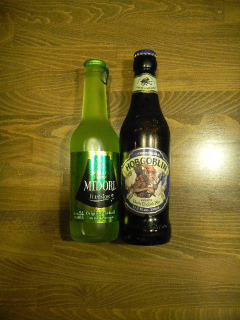 이 저녁 식사시에, 내가 마신 음료의 일부.왼쪽, 미도리(Midori)(일본의, 비교적, 세계적으로 이름이 알려져 있는, 멜론(melon)의, 리큐어(liqueur))를 사용한, 칵테일(co·cktail).오른쪽, 영국산의 맥주.이 외, 이 저녁 식사시는, 나는, 음료는, 술(알코올(alcoholic) 음료)은, 와인(wine)을 마셨습니다.
